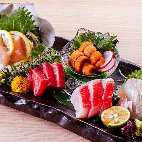 5種極み刺身盛り合わせ5,995円旬の魚はもちろん、その日自信を持ってオススメできる鮮魚を取り揃えました。是非ご賞味ください。(2~3人前) 5種3貫 生本マグロ中トロ ウニ ホタテ入り