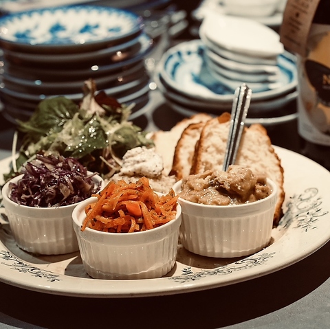 当店の魅力が詰まったの食材を使った創作おばんざいを少しずつ楽しめる「おばんざい盛り合せ」は、まず頼んでいただきたい人気メニュー◎無添加の自家製調味料と発酵調味料で素材の旨味を最大限に引き出した、心と体が喜ぶ優しい味わい。旬の味覚を楽しめるだけでなく、ナチュールワインとのペアリングも格別です!