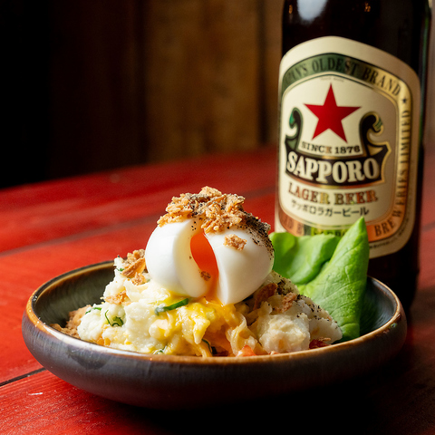 トロっと仕上げた半熟のゆで卵がどーんと乗った、【どら壱】特製の名物ポテトサラダ!半熟卵はお好みの加減にくずして、ホクホクのポテトサラダと一緒にお召し上がりください♪焼肉の合間に楽しむのにもオススメ◎ もちろんお酒のアテにもピッタリの、当店人気の一品となっております。