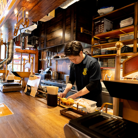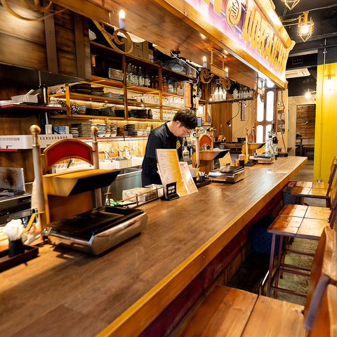 店内にはカウンター席も完備。調理風景を眺めながら、おいしいお食事やお酒をゆっくり楽しめる人気のお席となっております。お仕事帰りの一杯など、おひとり様でもぜひお気軽にお立ち寄りください!そのほか、木目調のお洒落なカウンター席はデートでのご利用などにもオススメです◎