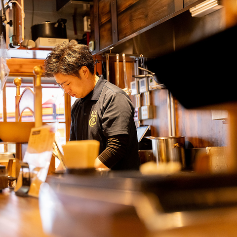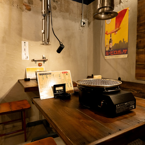 赤星が似合う、通好みのレトロ空間はココ!どこか懐かしく、温かい。そんな居心地の良さを大切にしています。木の質感が心地よいカウンターやテーブル席は、お一人様からデート、少人数の集まりまで幅広くご利用いただけます。卓上コンロを囲みながら、お酒を片手に至福のひとときをお過ごしください。