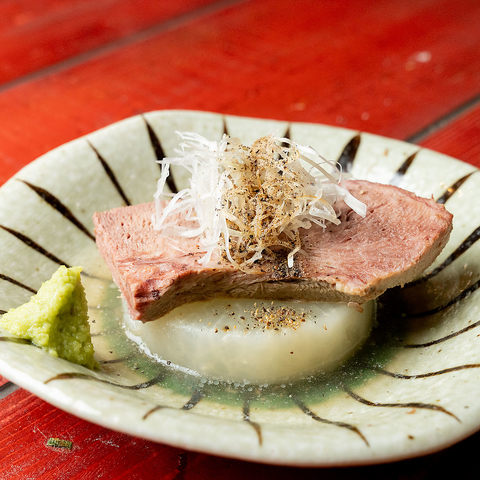 3時間以上じっくりと煮込んで仕上げた当店人気の茹でタン。箸でホロっといける、絶妙なやわらか食感がたまらない逸品でリピーターも続出!ハサミを一緒にお出ししますので、お好みの大きさにカットしてワサビや柚子胡椒でお召し上がりいただくのがオススメ。自信をもってご提供する必食のおいしさ、ぜひご賞味ください!
