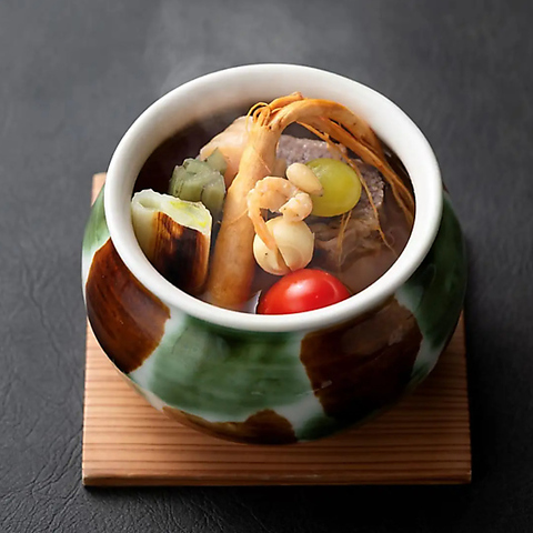 ■前菜:季節の肴七種盛り■吸物:名物美濃薬膳飛騨牛壺スープ■造り:季節鮮魚盛り合わせ■台物:飛騨牛鉄板焼き 120g■お食事:ご飯 留椀 香の物■水物:季節物