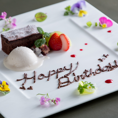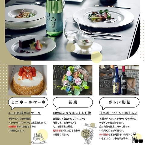 特別な日を彩るデザートプレートを無料でご用意させて頂きます。ホールケーキ(3,800円~)や華やかな花束(4,400円~)、思い出に残るボトル彫刻(5,000円~)などもオプションで追加可能です。事前にご連絡いただければ、思い出に残る素敵な演出をお手伝いいたします。コース料理とともに、特別なひとときを当店でお愉しみください。