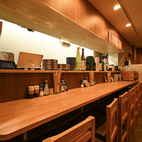 お仕事帰りや自分時間に最適な全6席のカウンター席をご用意!調理風景を眺めながら、店主との会話や、心ゆくまで料理とお酒を堪能できる「ちょい飲み」にぴったりの特等席です♪お一人様大歓迎!