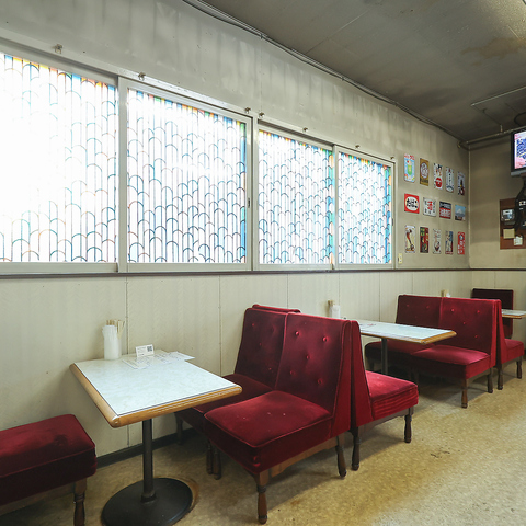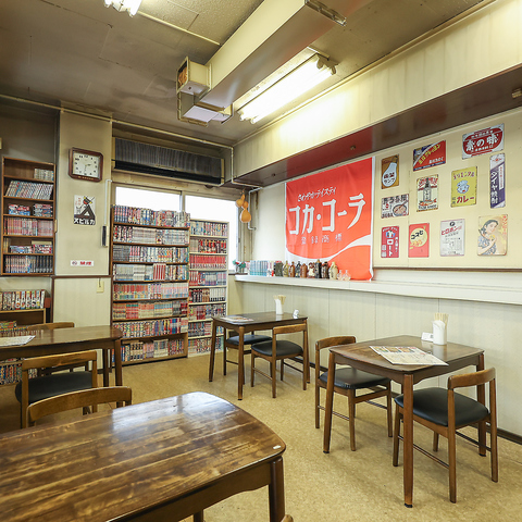 テーブル席は、昭和の喫茶店を思わせるレトロな装い。赤いソファに腰かけると、壁に飾られたポスターや漫画棚、レトロな広告が目に入り、昔懐かしい街角を思い出させます。木目のテーブルと柔らかな照明、窓から差し込む太陽の光が贅沢なひとときを演出し、会話も自然と弾むこと間違いなしです。