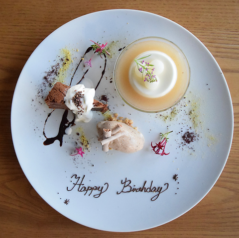 誕生日や記念日など、特別な日のお祝いには、ご予算に合わせて華やかなデザートプレートをご用意いたします。主役への感謝や祝福のメッセージを添えることも可能です。