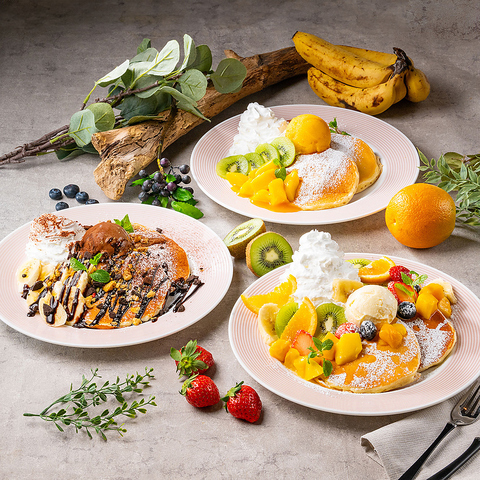 宝箱の様に盛り付けたフルーツにクリームとパンケーキで…。マンゴーやチョコレート、ベリー等種類充実