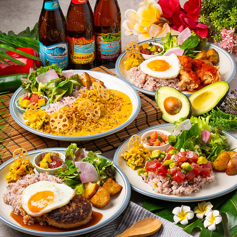 ハワイアン料理の定番“ロコモコ”をはじめ、人気メニューがぎゅっと詰まった彩り豊かなワンプレート。中でもおすすめは、牛肉の旨味が溶け込んだグレービーソースで味わう『グレービーロコモコプレート』。てりやき・BBQ・トマトサルサ・Wチーズなど、選べる5種のソースも魅力です。そのほか、モチコチキン、ビーフステーキ、アヒポキ充実!