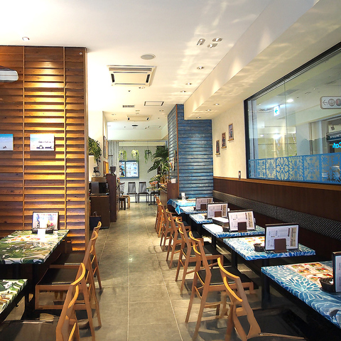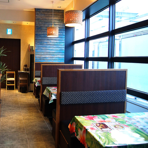 ゆったりとしたハワイタイムで過ごせる開放的な空間。テーブル席を中心に、デッキ席、BOX席、そして個室感覚でお過ごし頂ける席までご用意しております。