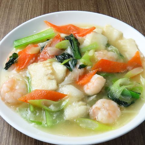 具だくさんのあんかけ焼きそばは、彩り豊かな新鮮野菜とプリプリの海老や豚肉が絶妙に絡み合った一品です!パリッとした焼きそばの上にトロリとしたあんが絡まり、まさに至福の味わい!食べ応えも抜群でボリューム満点です♪具材の旨味が溶け込んだあんは、最後の一口まで楽しめる贅沢な仕上がりです!