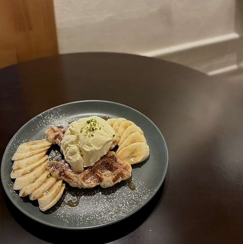クロワッサンをワッフルのように焼いて、バナナとバニラアイスとキャラメルソースを絡めて味わいください。