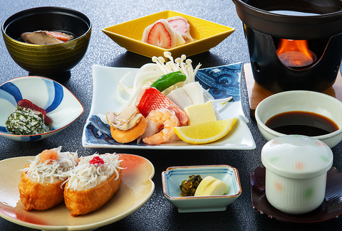 自分で焼くのが楽しい!海老、帆立、烏賊、カジキマグロ、金目鯛/海鮮あかもくトロロ掛け、茶碗蒸し、しらす稲荷寿司、けんちん汁、香の物、季節のデザート