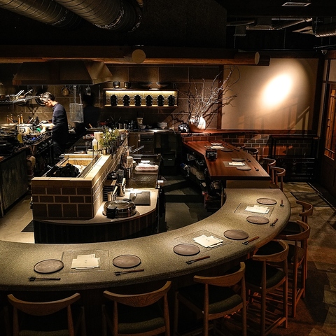 焼き師との距離が近いカウンター席。旬の食材を使った料理を目の前で楽しむことができます。焼き師と直接お話ししながら、素材の選び方や調理法など会話も弾みます。目の前で繰り広げられる美しい盛り付けや、香り立つ料理の数々が、五感を刺激し、心に残るひとときを演出します。