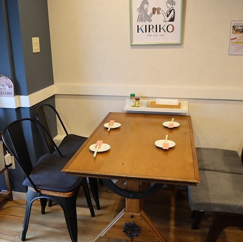 【テーブル席】お洒落な雰囲気の店内には、テーブル席を3卓ご用意しております。窓際には色とりどりの切子グラスが並び、目でも楽しめる空間です。気兼ねなくくつろげる空間で、美味しい料理と美酒を味わいながら、心ゆくまでお食事をお楽しみください。