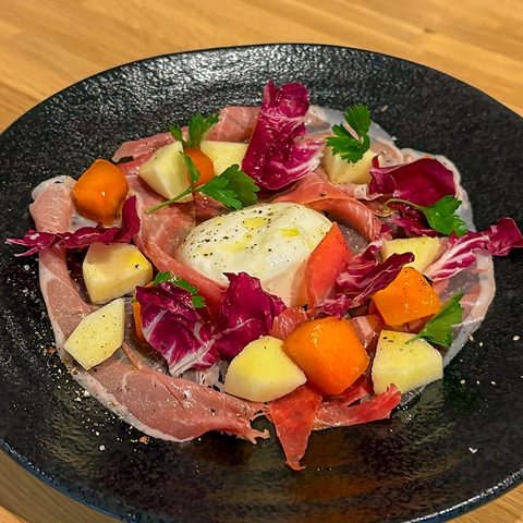 前菜は、旬の素材を活かした色彩豊かなラインナップです♪フレッシュな「季節果物のモッツァレラ」や、食感も楽しい「トリュフ塩のおつまみミックスナッツ」、ワインと相性抜群の「北一ミートのハモンセラーノ」など、バリエーション豊富にご用意しております◎食欲をそそる魅力的な前菜は、乾杯の一皿として最適!
