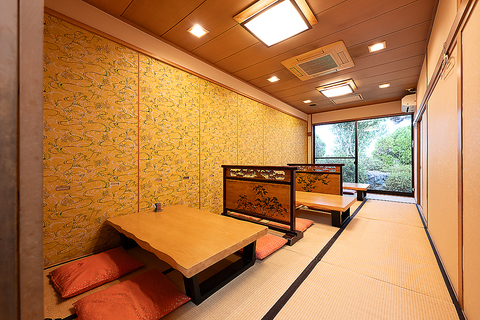格式ある意匠壁と畳の香りに包まれた広々とした大座敷。やわらかな灯りと庭の景色が調和し、落ち着きと品格を感じる和のくつろぎ空間です。宴会・法事・ご会食に最適。