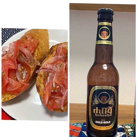 お腹はいっぱいだけど軽く昼飲みしたいなぁ、という人にはこれ!アルコール飲料とサンブーサ(大)1つ、またはカチュンバリブルスケッタ2切れで、飲料が200円引きになります。写真はエチオピアビールとブルスケッタの例です。他にワインやハイボール等とも組み合わせられますよ。(もちろん夜もやってます!)
