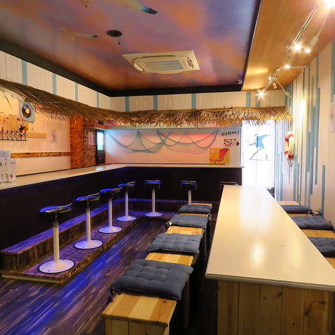 【気軽に非日常♪海の家風のゆるっと空間】 店内はまるで南国リゾート!ヤシ風の飾りや夕焼けアートが広がってて、気取らずくつろげる雰囲気。遊び心ある仕掛けもいろいろあって、飲み会や誕生日会にもぴったり。ふらっと来ても、仲間と来ても、なんだか楽しくなっちゃう空間です♪