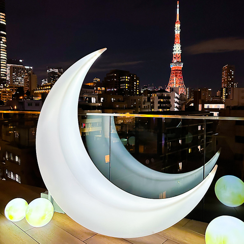 当店のテラス席は、まさに夢のようなフォトスポット。 大きな月のオブジェをアクセントに、東京タワーをバックにした写真はインスタ映え間違いなしです。 夜景、アート、そして美食。五感で楽しむ特別なディナーをお約束します