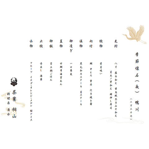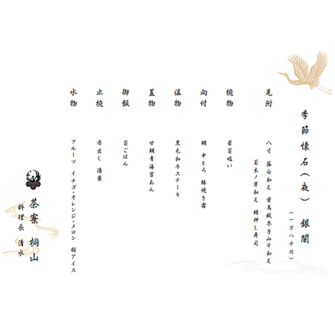 美しい日本庭園を眺めながら格別な夜のひとときを。季節懐石は、その時期一番の旬の食材を贅沢に使用。海鮮のお造りや黒毛和牛、色鮮やかな京野菜、職人技が光る一皿をご提供いたします。金額によって品数が変わりますので、大切な記念日や接待など、ご用途に応じてお選びいただけます。