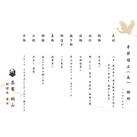 ■先附:八寸 蕗白和え・蛍烏賊芥子みそ和え・筍木ノ芽和え・鯖押し寿司/■椀物:若筍吸い/■向付:鯛 中とろ 雲丹 穴子焼き霜/■温物:黒毛和牛ステーキ 筍ステーキ/■御凌ぎ:一口蕎麦/■蓋物:甘鯛青海苔あん/■御飯:筍土鍋ごはん■止椀:赤出し 湯葉/■水物:フルーツ イチゴ・オレンジ・メロン 桜アイス