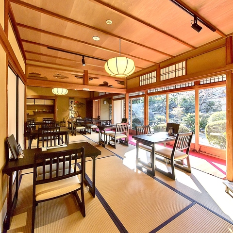 一階の広間のテーブル席です。客席からは、百年の歴史を湛える日本庭園が広がります。