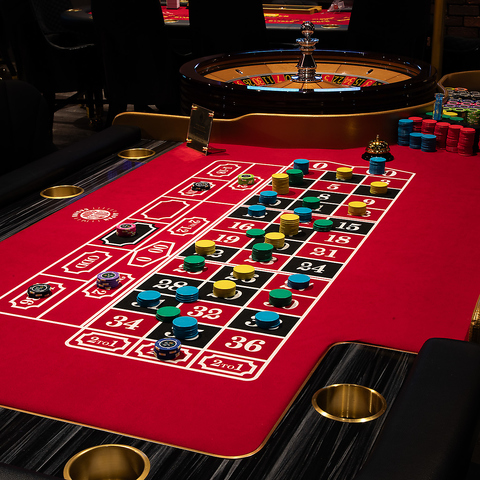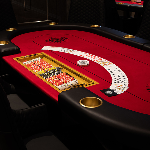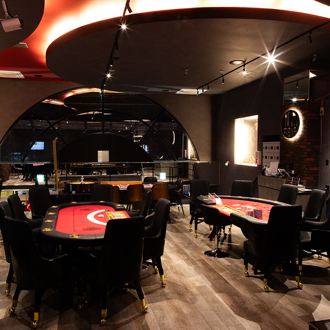 スタイリッシュな天井デザインと重厚なインテリアが印象的な店内には、赤を基調としたポーカーテーブル、カードシューやチップなど本格的なカジノ設備がずらり。大型スクリーンやモニターも完備され、まるでラスベガスのような臨場感を演出します。日本にいながら本場の空気感と興奮を味わえる、贅沢なカジノ空間です。