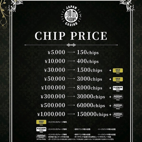 まず、5,000円~30,000円分までのチップのご購入いただき、そのチップを元に各ゲームをお楽しみいただけます。一度に30,000円以上お買い上げの場合、次回以降1か月間の入場料1,000円が無料に!