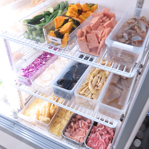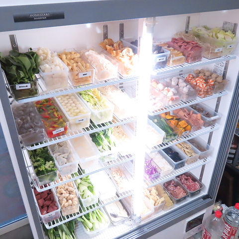 当店では、メインの火鍋をさらに楽しんでいただくために、お客様自身で具材を選べるユニークなスタイルを採用しています◎店内のショーケースには、新鮮な肉や野菜、きのこなどがずらりと並んでおり、好きなものを好きなだけ選べます。