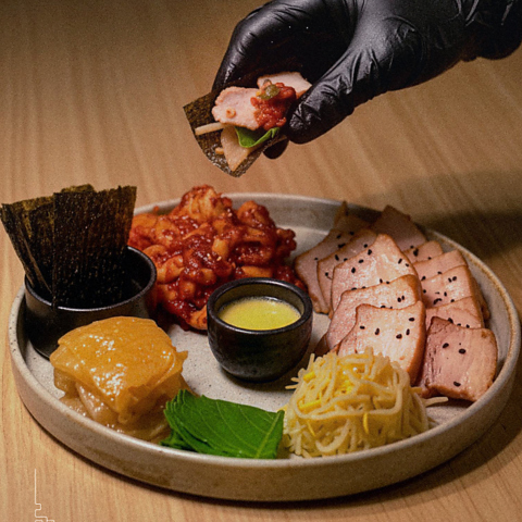 韓国の伝統的な「三合 (サンハプ)」をモチーフにしたヌビのシグネチャーメニュー。香ばしく炙ったピリ辛のイイダコと、低温でじっくり火入れした柔らかな豚バラ肉を香ばしい炎の香りとともに美しく盛り付けました。それぞれの副菜と組み合わせることで、一皿の中でさまざまな味の調和をお楽しみいただけます。ピリ辛さの中に、香ばしさ・甘み・そして奥深い旨味が広がるヌビならではの絶妙な味わいをぜひご堪能ください。