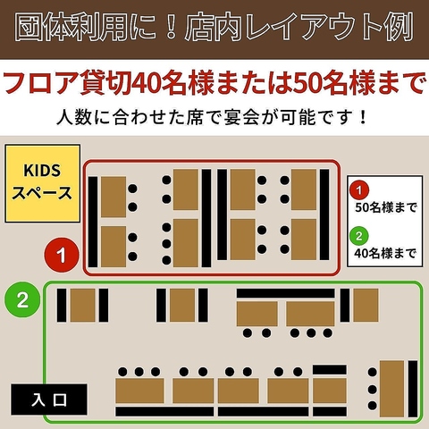 【レイアウトのご紹介】フロア貸切は40名様または50名様までのお集まりが可能◎人数に合わせた席をご用意いたします。また、キッズスペースも完備しておりますので、お子様がいる団体様も安心してご利用いただけます。会社の飲み会や学生の打ち上げなど、大人数での宴会はぜひ当店へお越しください♪