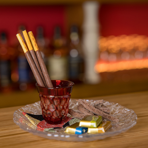 ウイスキーとの相性を考え抜いた、特製チョコレートの盛り合わせ。国産のピールチョコなど、個性豊かなショコラをご用意。お好みのウイスキーとの至福のマリアージュをお楽しみください。