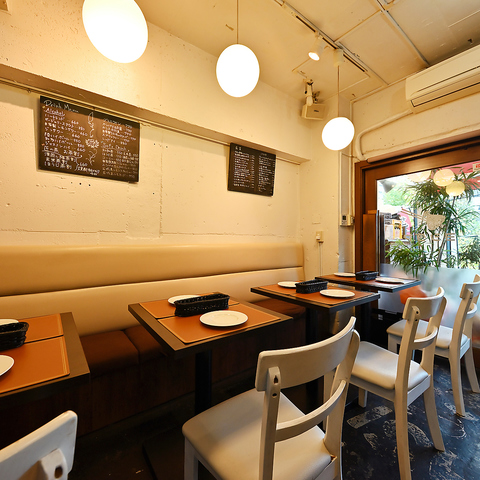 ベンチシートでゆったりくつろげるテーブル席。手書きの黒板メニューを囲んで会話が弾むアットホームな空間