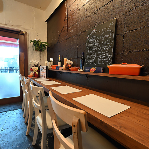 シックな黒いブロック壁が目を引くカウンターは全4席。可愛らしい小物やワインボトルが並ぶ、おしゃれで温かみのあるお席です。気兼ねなく自分のペースでゆったりと過ごせるため、美味しいお酒や料理の余韻に浸る一人飲みや、会話を楽しみたいカップルでのカジュアルなディナー、デートに最適です。