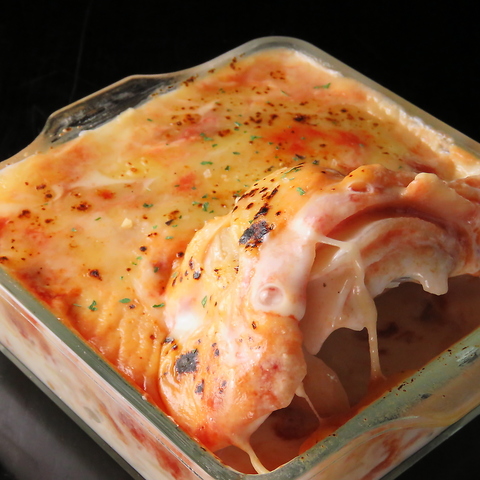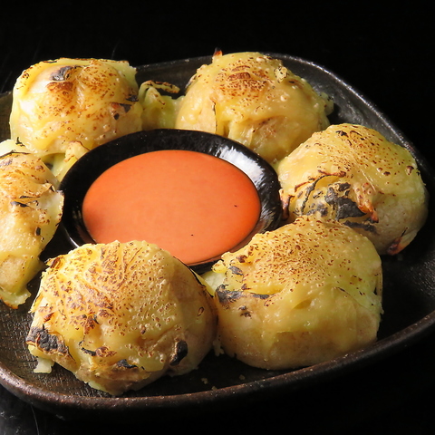 パリトロ食感がクセになる!北海道産きたあかりを贅沢使用。下にチーズをひき、ジャガイモを少しつぶしてチーズをさらにかけてオーブンでじっくり焼き上げています。とろけるチーズとオーロラソースの深いコクに、ラー油のピリ辛さがアクセントを添える、まさにやみつきになる一皿です。お酒との相性も◎