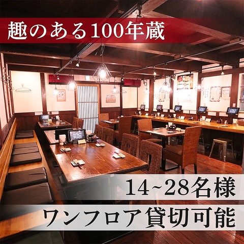店奥に佇む「百年蔵」は貸切最大28名様まで。時を重ねた寛ぎの空間で、厳選の銘酒と蕎麦を心ゆくまで。