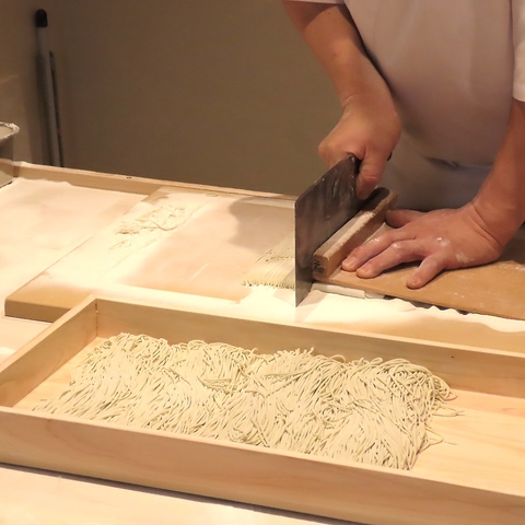 【毎日打ち立てのこだわりそばをぜひ】当店では、厳選された国内産のそば粉だけを使用し、お客様に最高の状態でご提供するため、専用の打ち台にて、職人が毎日その日の気候に合わせて丹精込めて手打ちしております。打ちたてならではの力強い風味をぜひご堪能ください。