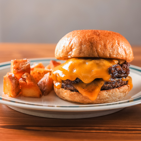 甘くとろけるオリジナル煮たまねぎと濃厚チェダーチーズの味わいが肉の旨みと見事にマッチしたハンバーガー♪ダブルチーズバーガーやトッピングもございます!(パティ、チェダーチーズ、煮玉ねぎ、ピリ辛ソース)