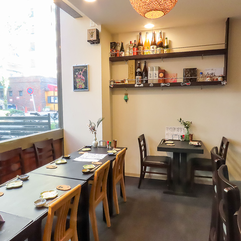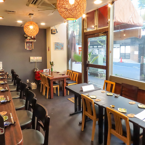 カウンター席は広めのスペースでゆったりしており、椅子も大き目でゆっくり出来ます。会社帰りに気軽に立ち寄れる賑やかな雰囲気の店内では、独創的な創作料理が楽しめます。ピリ辛でニンニクが利いたふりかけを掛けるスタイルの毛沢東唐揚は、柔らかい食感とカリカリのふりかけが相性抜群でおすすめの逸品です。