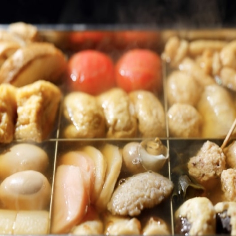 秘伝の出汁でじっくり煮込んだおでんは、芯までしっかりと味が染み込んだ深い味わい。大根、卵、練り物など定番の具材はもちろん、季節の変わり種もご用意しています。おでんの繊細な風味は、各種お酒との相性も抜群。特に、コースのメインである串焼きが出来上がるまでの待ち時間や、冷えた身体を温めたい時にぴったりの逸品です。