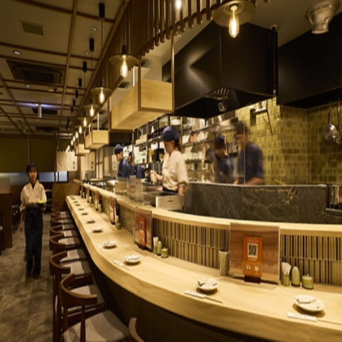 【ライブキッチンを眺めるカウンター席】店内中央に位置するカウンター席は、職人が串焼きを焼く様子や、調理のライブ感を間近で感じられる特等席です。お一人様やデートでのご利用に最適で、出来立て熱々のお料理をすぐにご提供いたします。ドリンクを片手に、職人技を眺めながらゆったりとした時間をお過ごしください。
