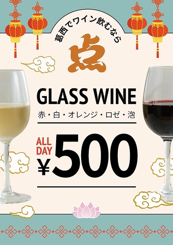 【中華酒場点の名物】赤・白・オレンジ・ロゼ・泡が1杯500円(税込)でお楽しみいただけます♪お好きなワインをお楽しみください♪
