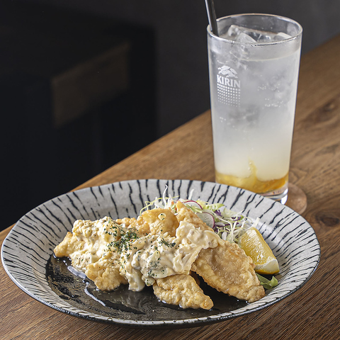 外はサクッ、中はふんわりな白身魚に、ホクホクのポテトを添えた大人気の一品!新鮮な卵と野菜を使った自家製タルタルソース◎この濃厚なソースが、揚げたてのアツアツな魚とポテトに絡み合い、食欲をそそります!+30円(税込)で柚子胡椒タルタルへ変更可能!爽やかな香りとピリッとした辛さがまた違ったおいしさに♪