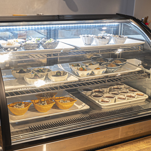 当店自慢のショーケースには、小鉢がぎっしり。ランチでは小鉢を2つショーケースからお選びいただけ、ディナーにはおつまみとして、ご注文いただけます。当店でのお食事をいろどる見た目も楽しんでいただける、こちらのショーケース。わいわいと是非楽しく小鉢をお選び下さい☆