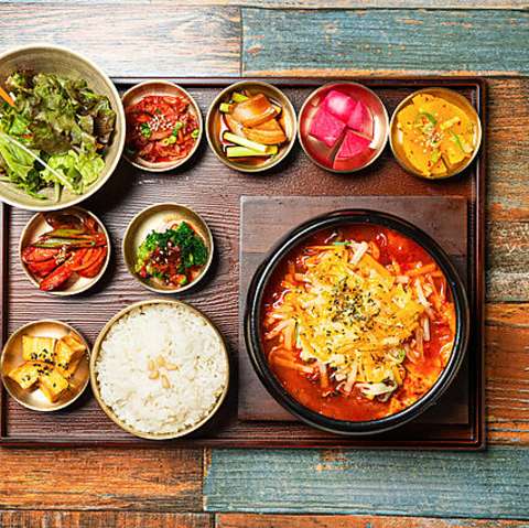 海鮮スンドゥブチゲやタッカルビ、水冷麺やビビンバなど種類豊富なランチ。日替わりの8つの韓国おかず付き