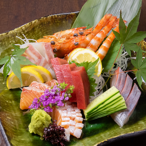 新鮮な海の幸を当店の職人が腕によりをかけて盛り合わせにしました。旬の魚介を使用した「刺身盛り合わせ」は、ぷりぷりの海老や、脂の乗ったサーモン、歯ごたえの良い白身魚など見た目にも美しい一皿です。単品では3種盛り・5種盛りからお選びいただけ、各種コース料理でも存分にお楽しみいただけます。華やかな見た目は各種宴会にも最適です♪