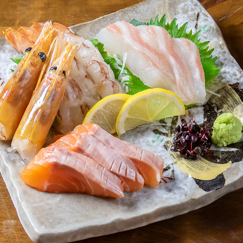 新鮮な海の幸を当店の職人が腕によりをかけて盛り合わせにしました。旬の魚介を使用した「刺身盛り合わせ」は、ぷりぷりの海老や、脂の乗ったサーモン、歯ごたえの良い白身魚など見た目にも美しい一皿です。単品では3種盛り・5種盛りからお選びいただけ、各種コース料理でも存分にお楽しみいただけます。華やかな見た目は各種宴会にも最適です♪
