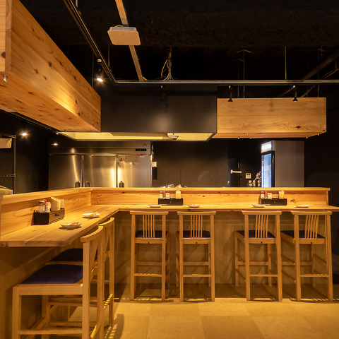 当店では、落ち着いた雰囲気のカウンター席もご用意しております。一人でゆっくりお食事やお酒を楽しみたい方、大切な人とのひとときを過ごしたい方にぴったりです◎お席から調理の様子を見ることもできます!