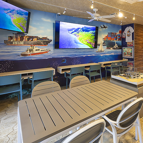 目の前に広がるプールの水景と、遊び心あふれるデザイン。昼は太陽の光に輝く水面を眺めながらリゾート気分でカフェタイム。夜はライトアップされた水景が幻想的に輝くエンタメ空間へと変わります◎壁・クロス・照明にまでこだわりが詰まっていて、特別な雰囲気を演出しています。